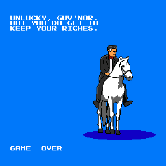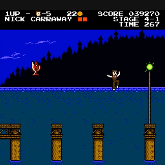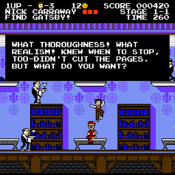 Charlie Hoey and I created a warmly received NES-style video game adaptation of The Great Gatsby. You can play it here. Michael DiMotta did some really wonderful promotional art for it. Here are some nice pieces about it in The Wall Street Journal, Kotaku, The Rumpus, and Nintendo Player. And here's the chiptune-meets-ragtime soundtrack. (Update for 2022: Gatsby is now an actual NES rom!)